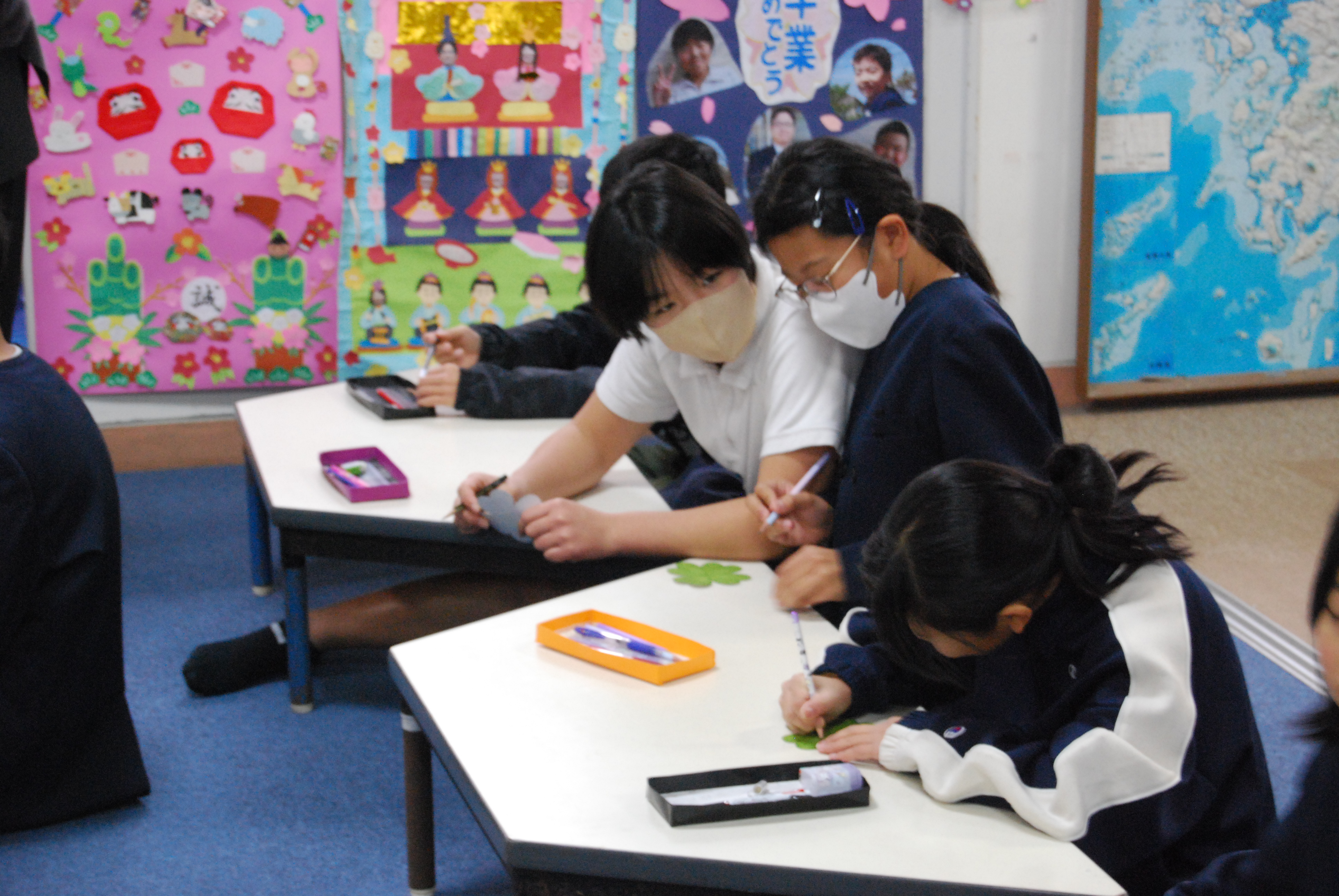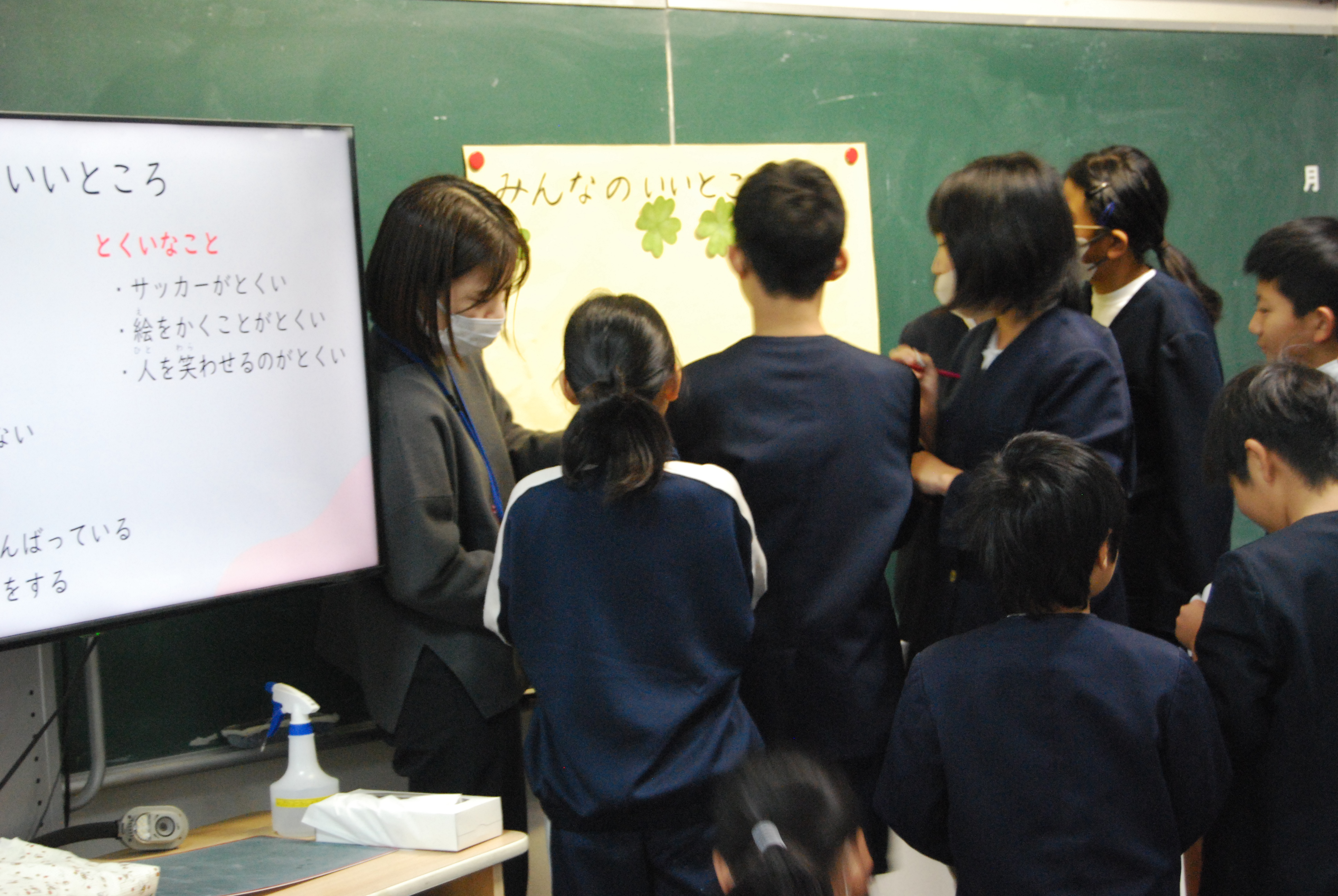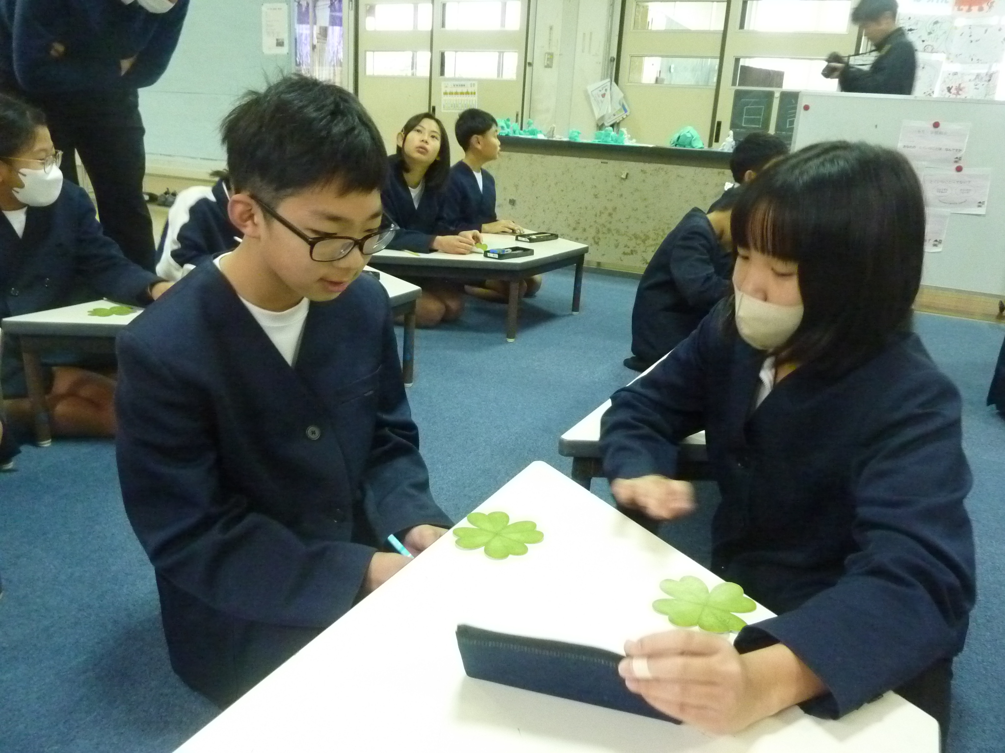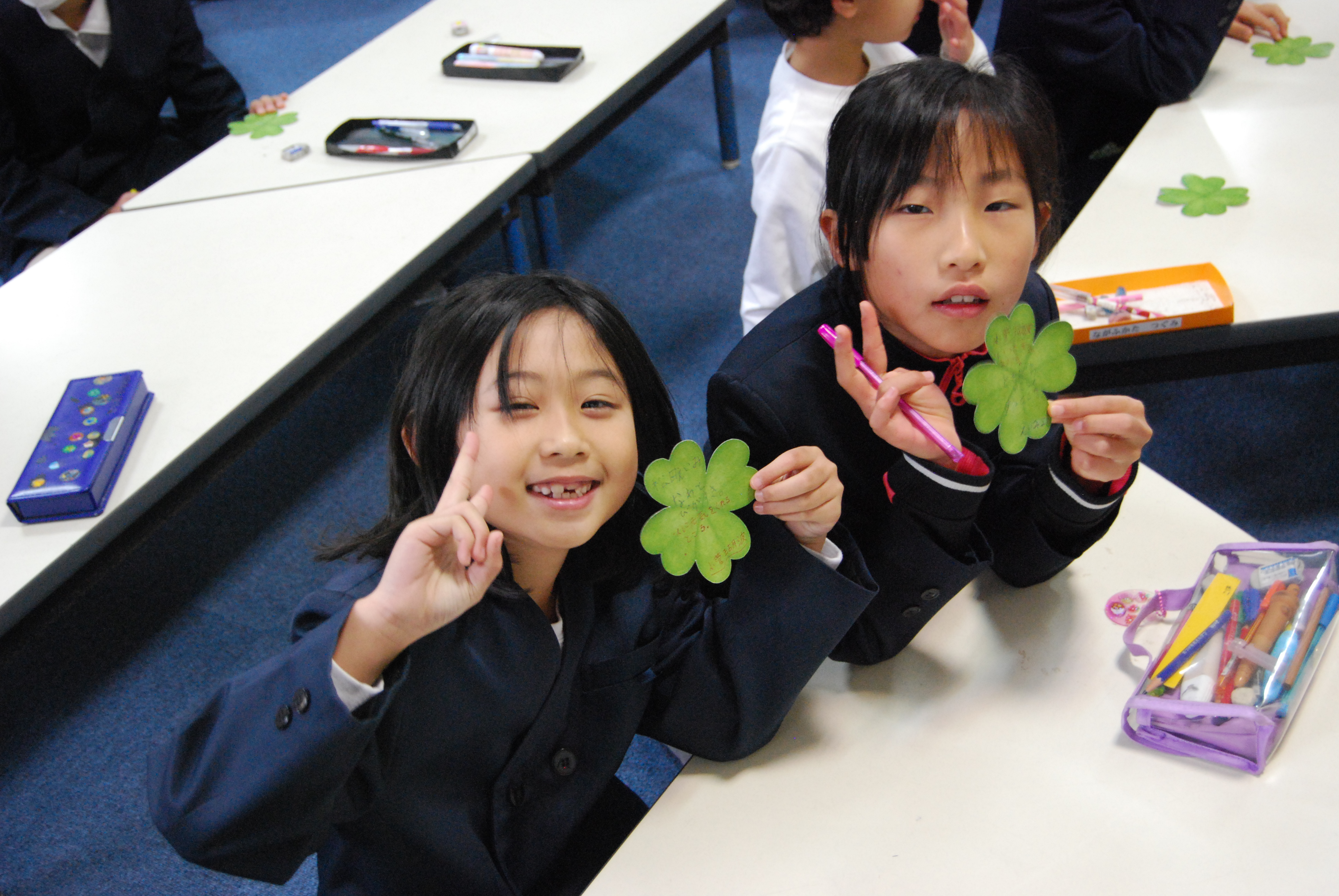 幸せの象徴とされていクローバーをかたどった紙に,自分の良いところ,ペアのお友達の良いところを書いて交換する活動を行いました。はじめは「自分の良いところって,どんなところ・・・?」「はずかしいな・・・」と手が止まっていましたが,だんだんと自分そして相手のよさを見つけて喜び,活発に交流するようになっていきました♪