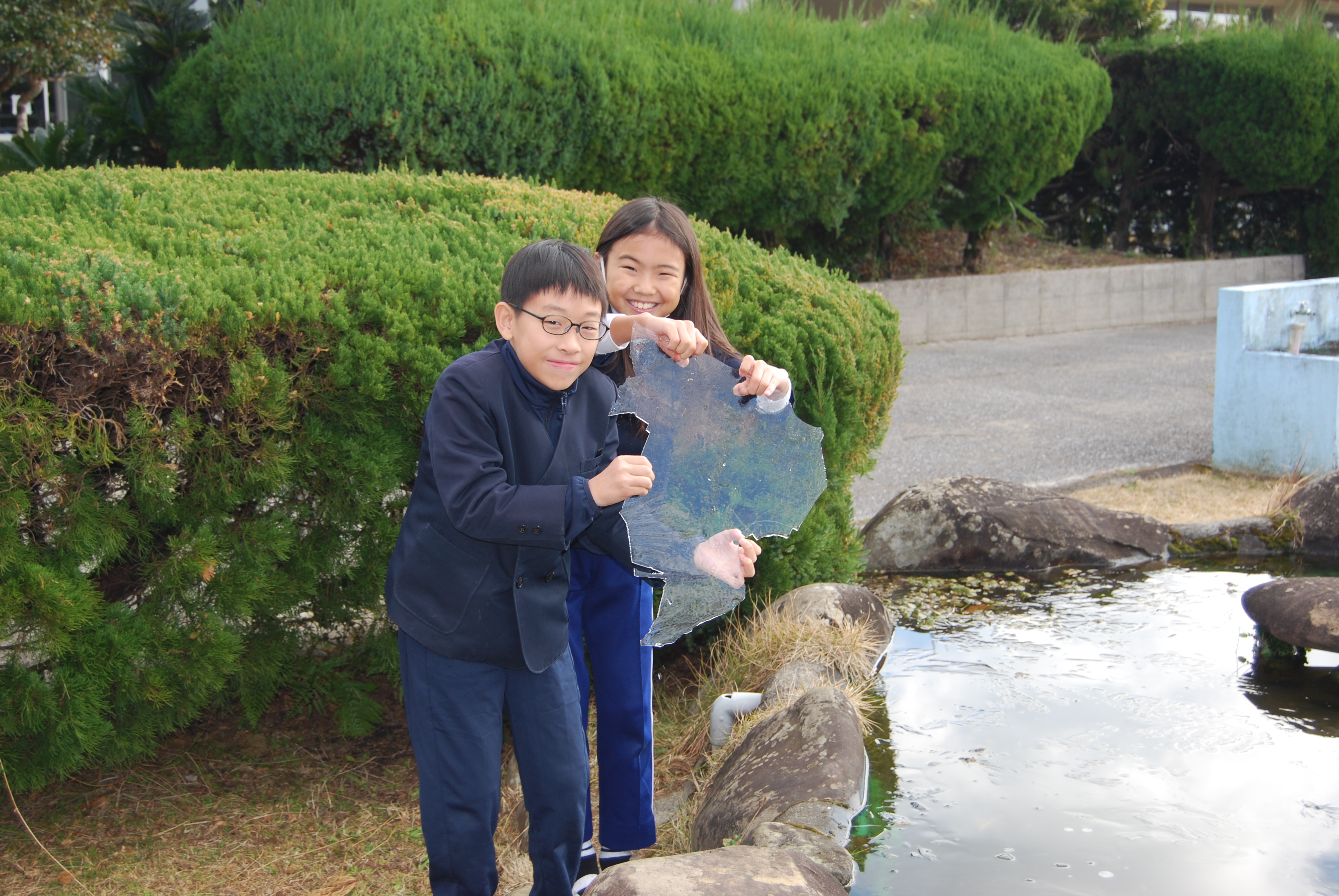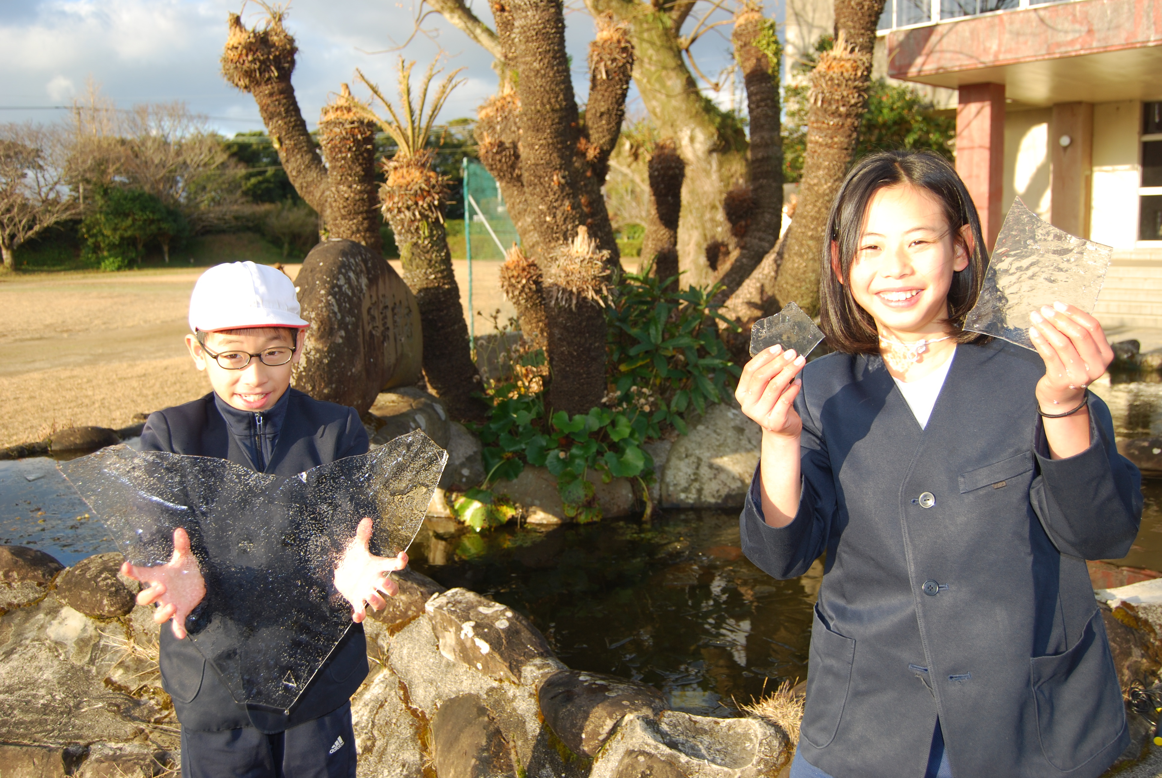 なかなか見ることのない貴重な生活体験をすることができました☃ 昼には氷も融けてなくなっていましたが,陰日向を見ると・・・