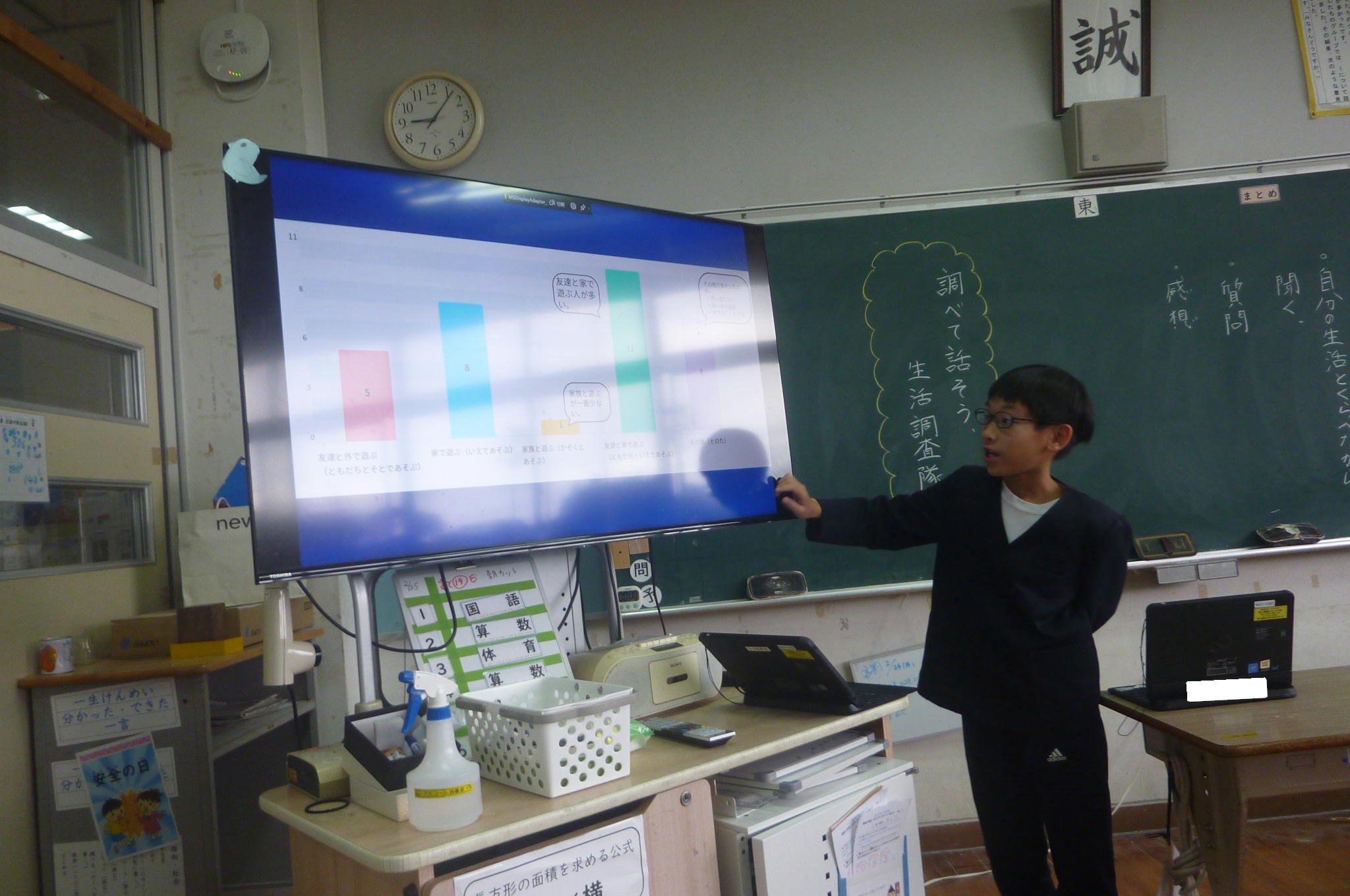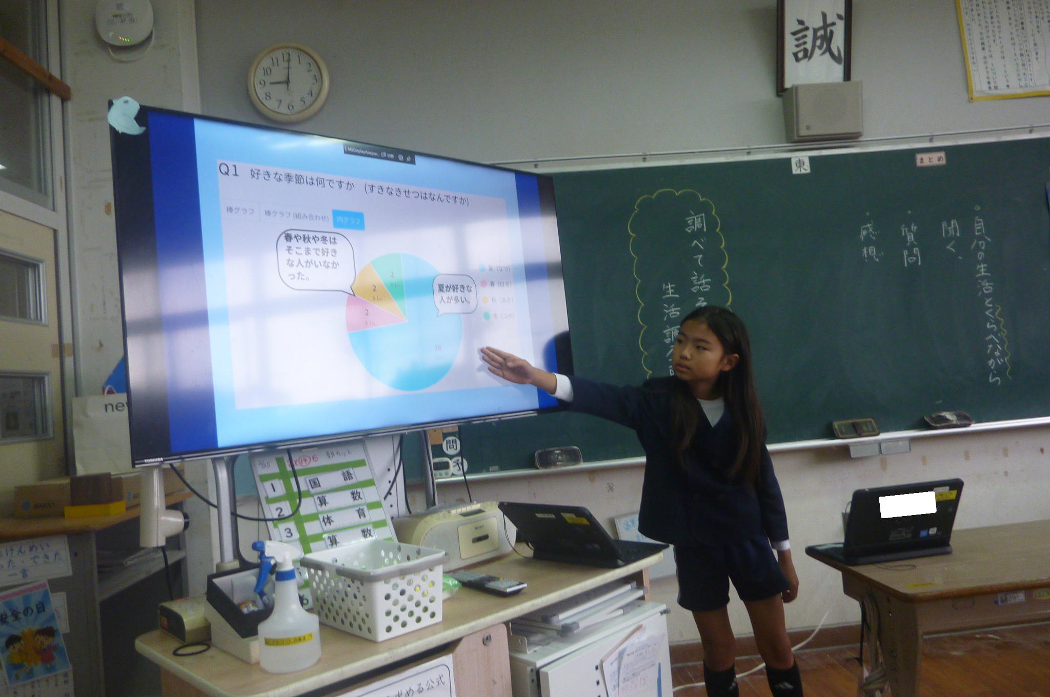 タブレットのアンケート機能を使って全校児童を対象に調査を進め,まとめたグラフの結果を比較して分かったことを追記するなどできていました。また,落ち着いたスピード且つはきはきとした声で発表ができるよう,タブレットで撮影して練習を重ねるなどしていることが分かり,日頃の授業でのICTの活用ができていることがとても伝わりました。