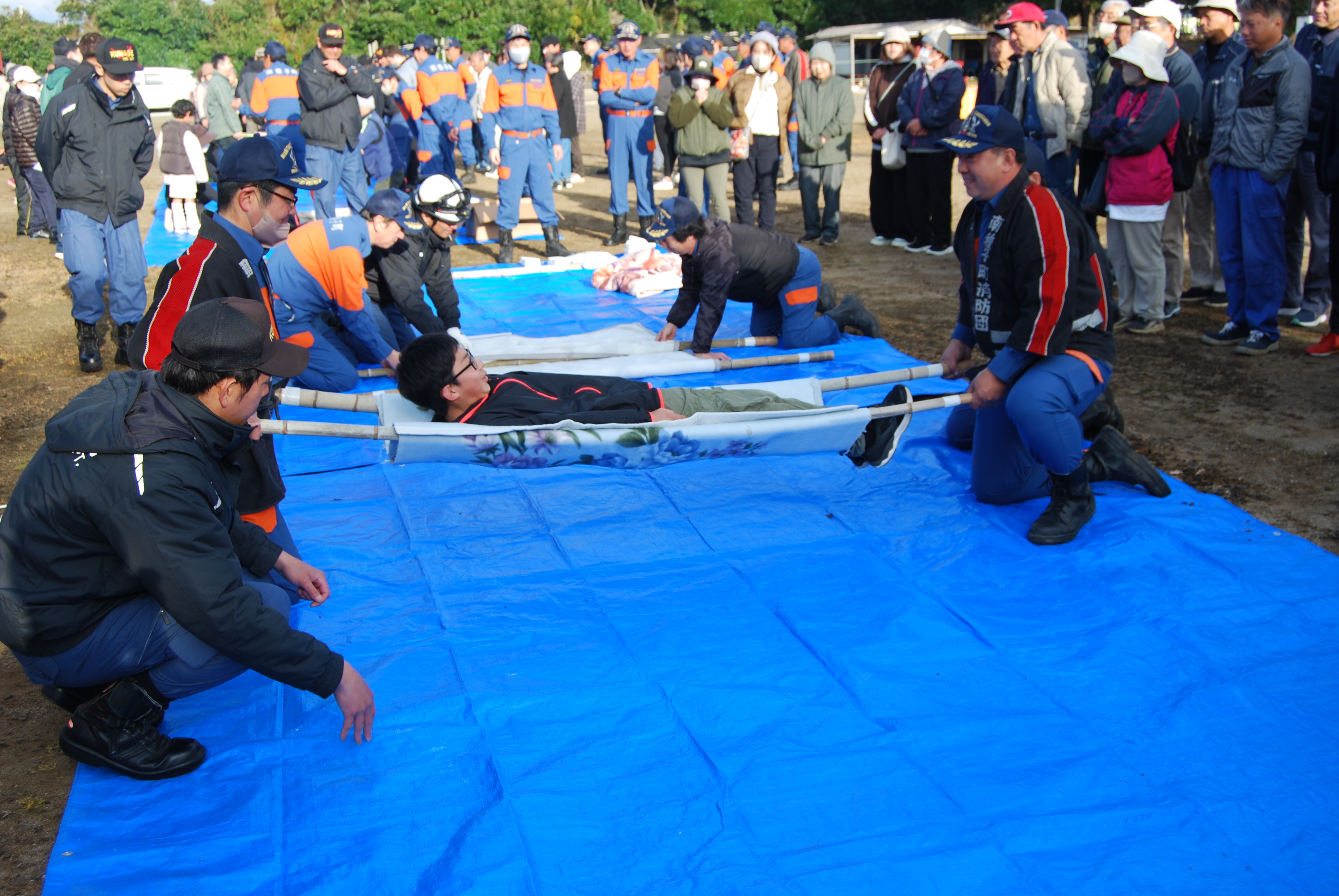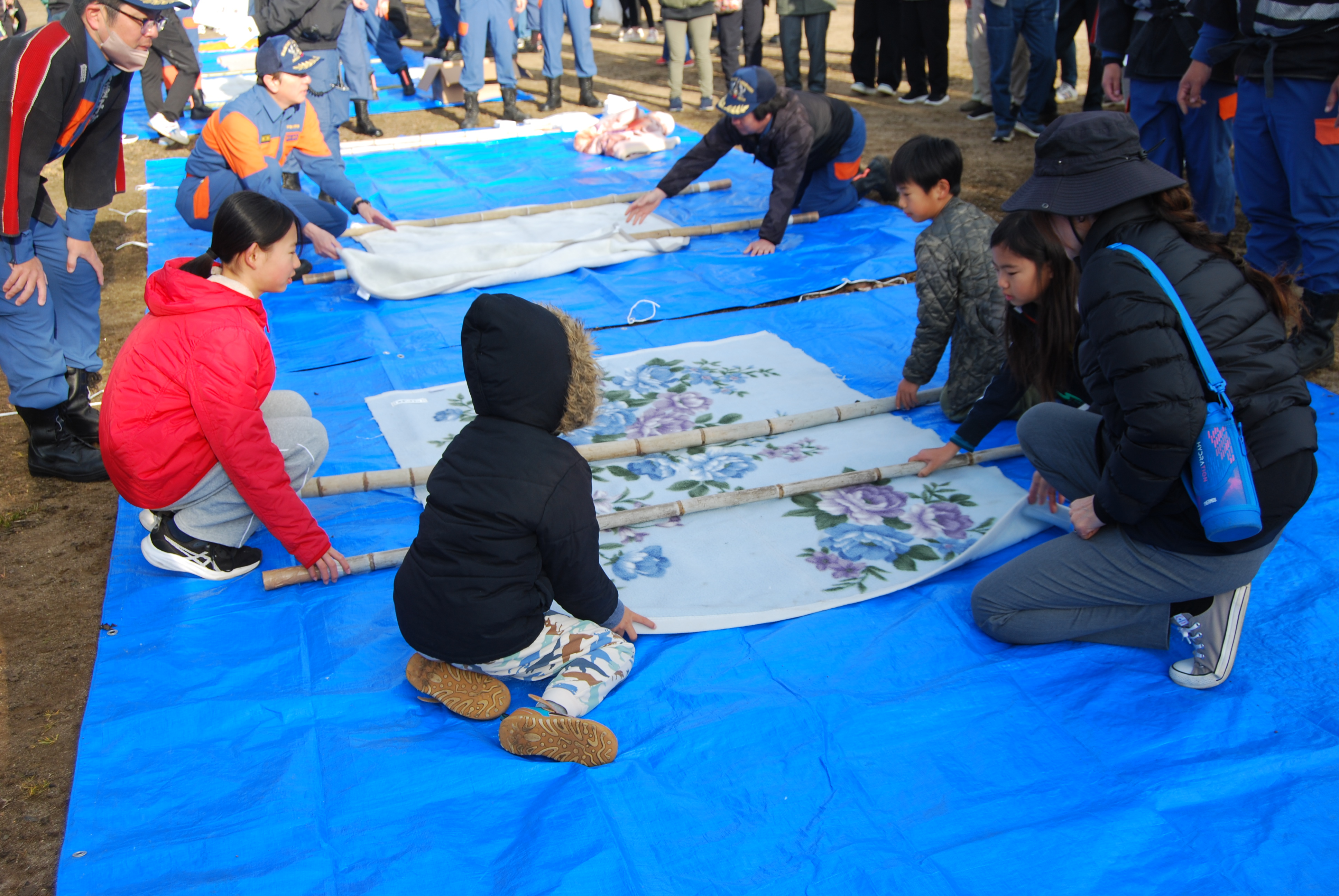 迅速に負傷者を運ぶための,応急担架づくり。