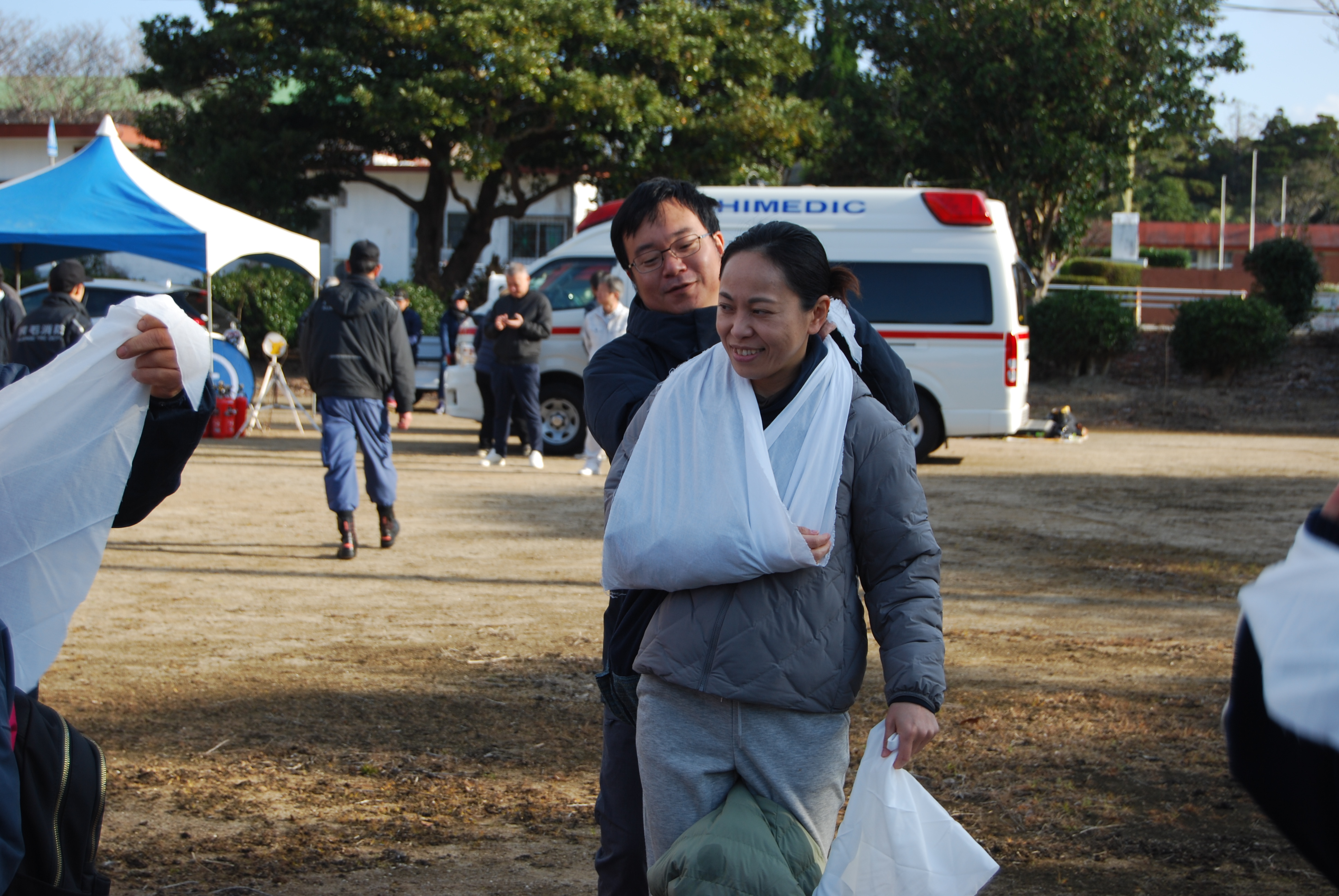 負傷した腕を吊す三角巾の結び方。本校職員も真剣に消防分団の方の説明を聞いて練習。