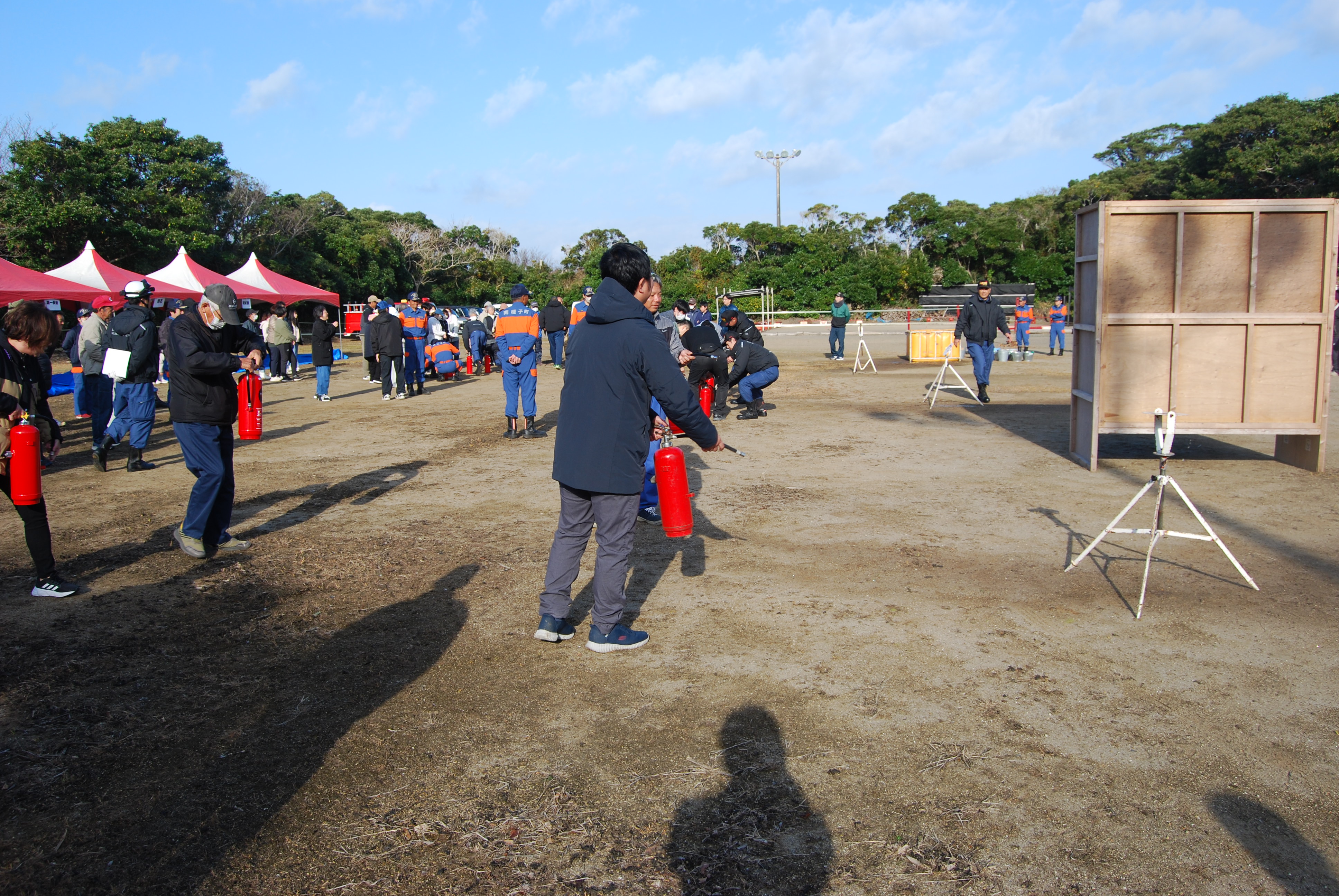 消火器による消火訓練。何度やっても,緊張すると手順を忘れてしまいがち。落ち着いて,迅速に火元を消火。