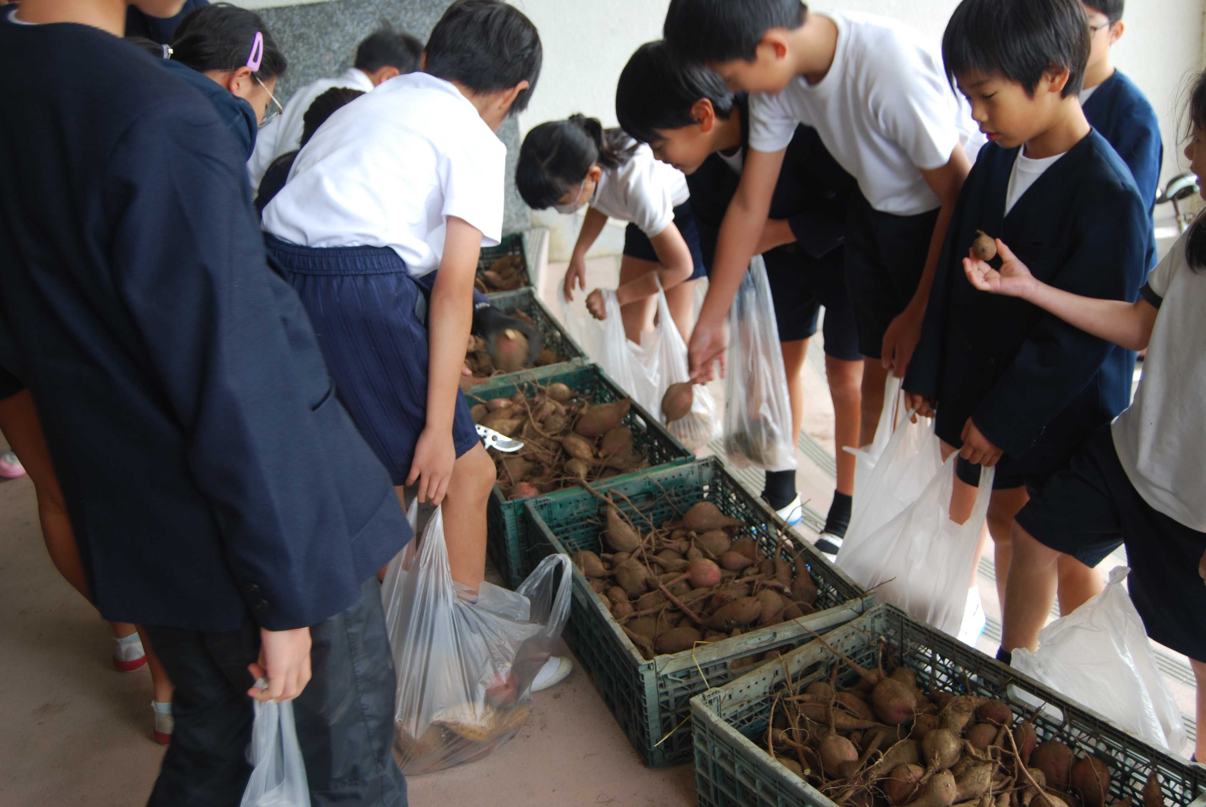 本日5校時は,6月末に苗を植えた安納芋の芋掘りを行いました。本来であれば蔓を切っておくところですが,「子供たちに,本来の芋掘りを体験してほしい」というねらいから,あえて蔓を残したままにしました。蔓を引っ張るのはかなり力が必要で悪戦苦闘しましたが,みんな段々と要領をつかみ出し,どんどん芋を掘り出す子供たち。そして今回も,多くの保護者の方々に御協力いただきました。畑の耕耘から芋植え,芋掘りのレクチャーまで引き受けてくださった冨PTA会長はじめ保護者の皆様,ありがとうございました!