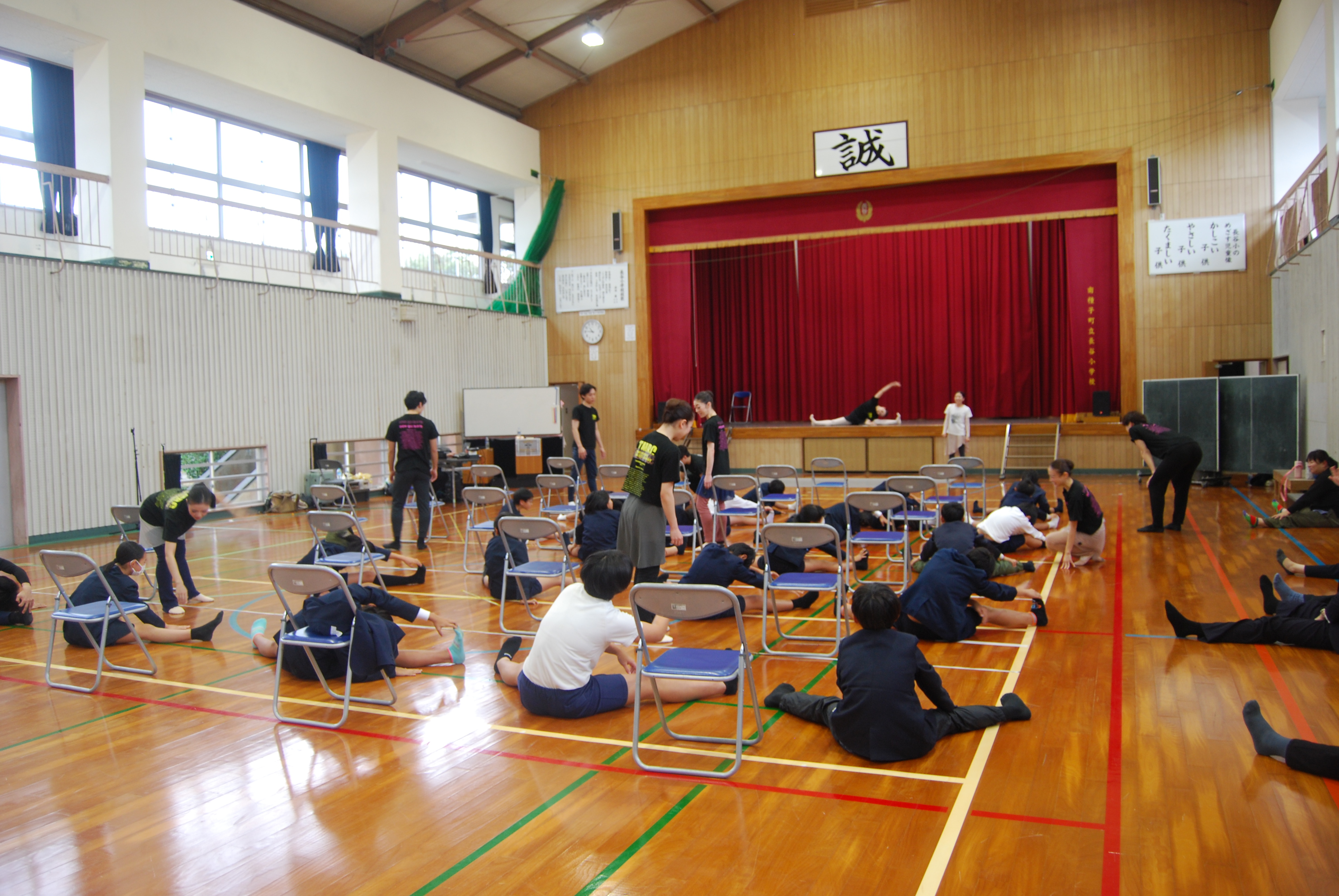 まずはワークショップを開講。バレエレッスンの初歩のストレッチを,児童も教職員も練習しました。柔軟性のある子供たちを尻目に,悲鳴を上げる教職員たち・・・😂