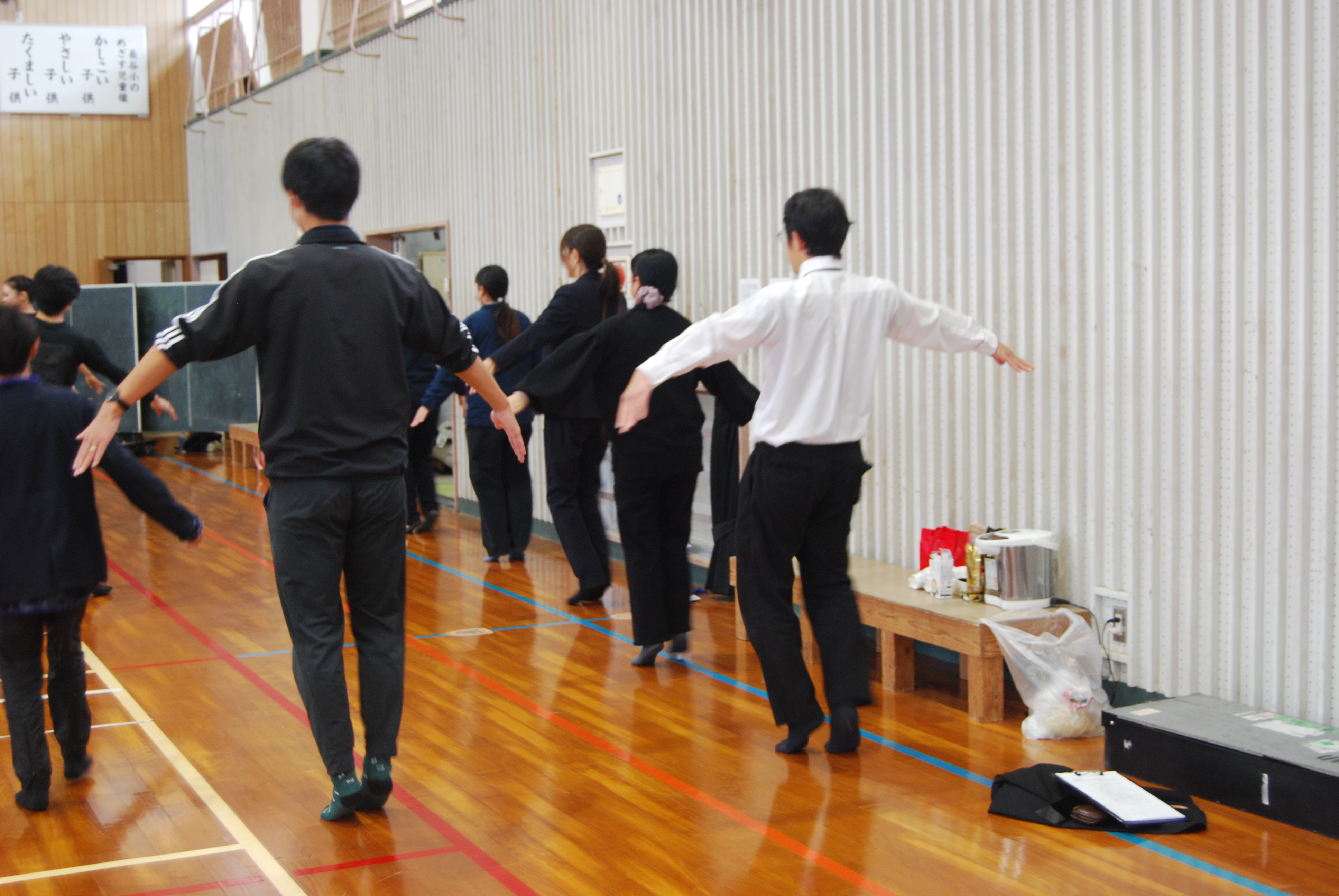 バレエの基本形の練習も行いました。華麗なステップをこなしていく教職員たちの後ろで,ぎこちない教頭先生。