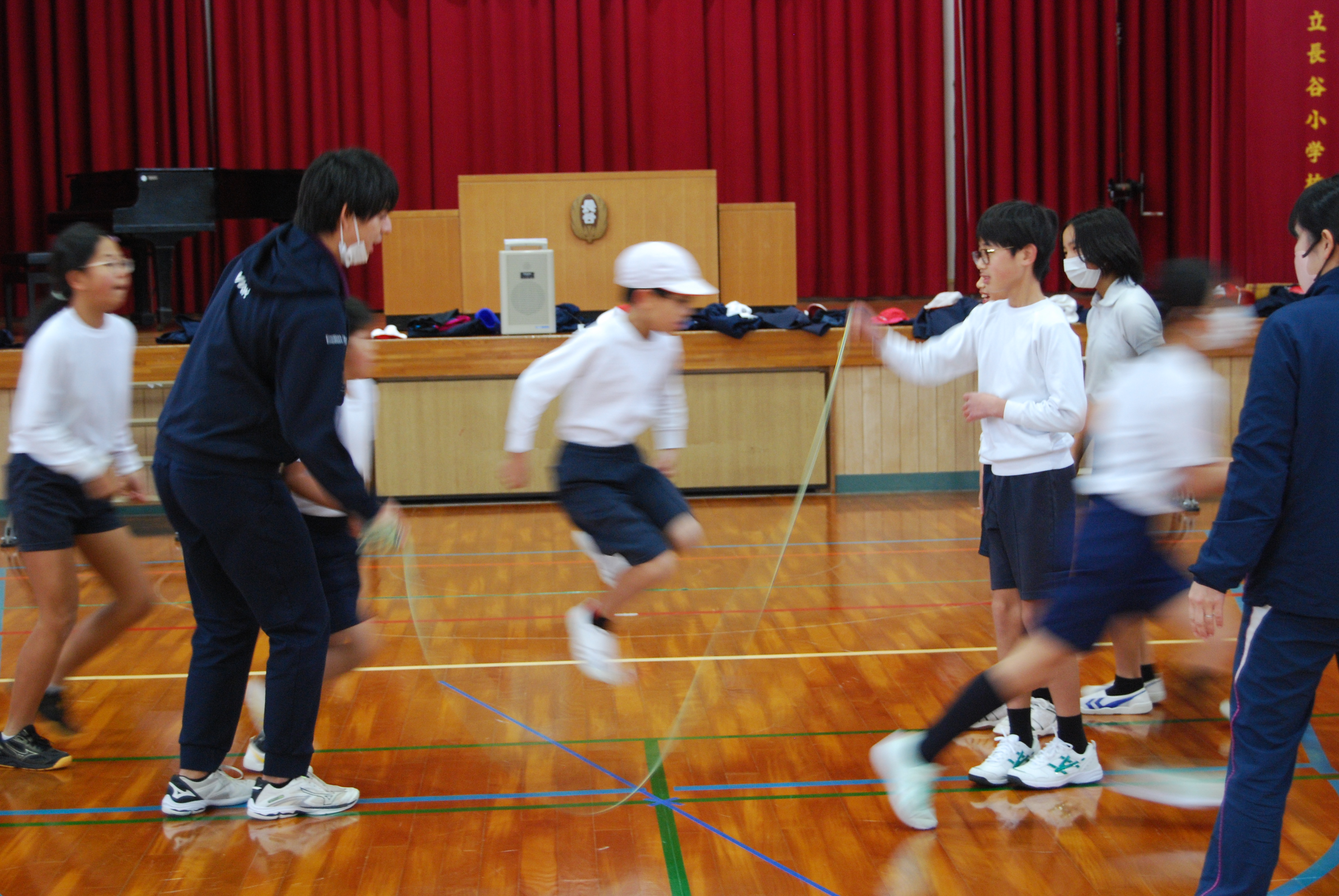 今日の朝の活動は,全校仲良し体育。低学年と中・高学年に分かれて長縄跳び(8の字跳び)にチャレンジしました。