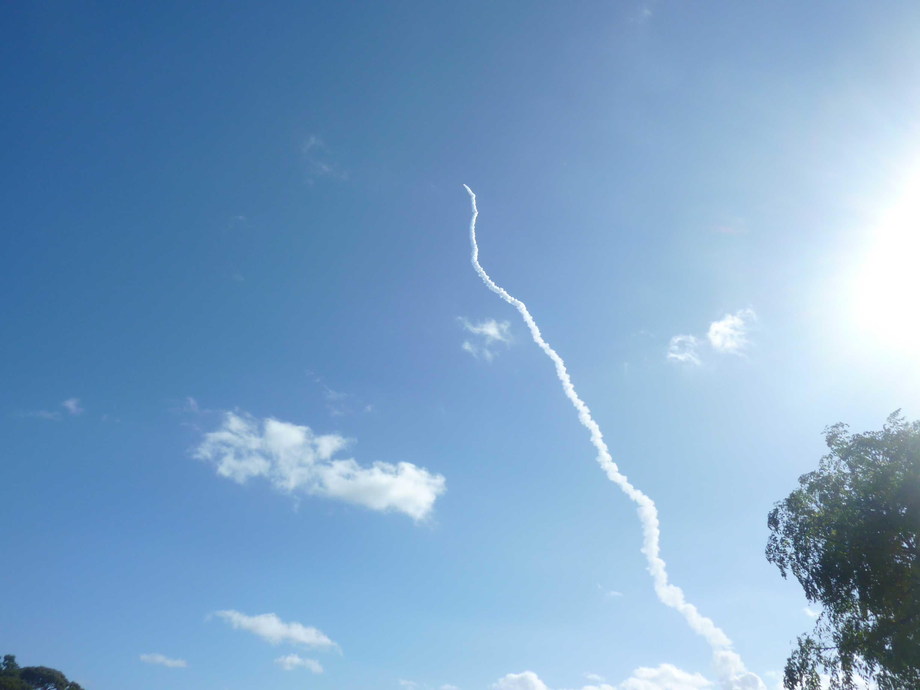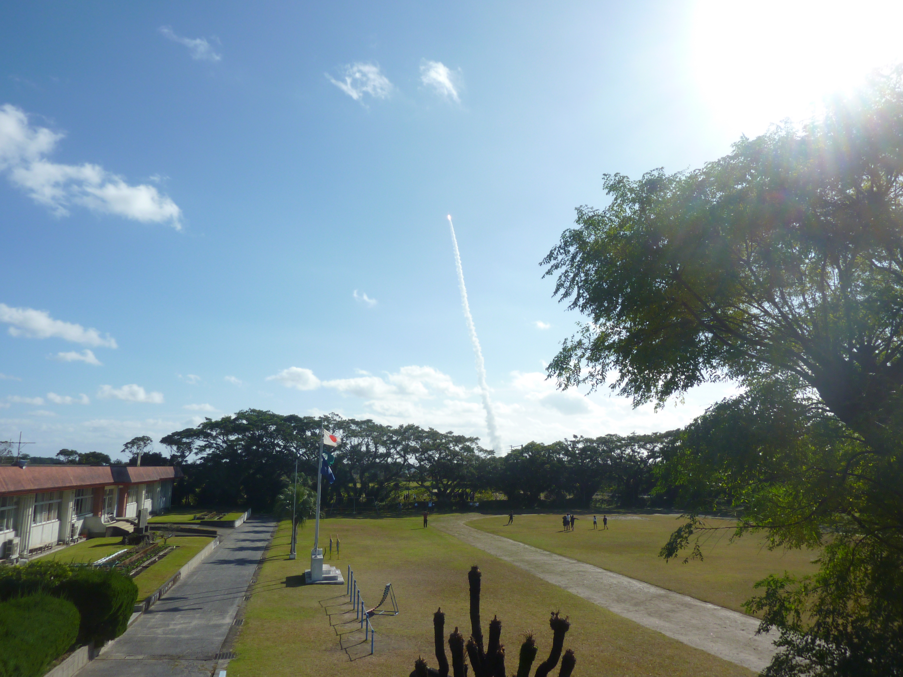 校庭の「�ロケットの見える丘」に児童も教職員も保護者の方も集まって,8号機の堂々たる飛行を見守ることができました。