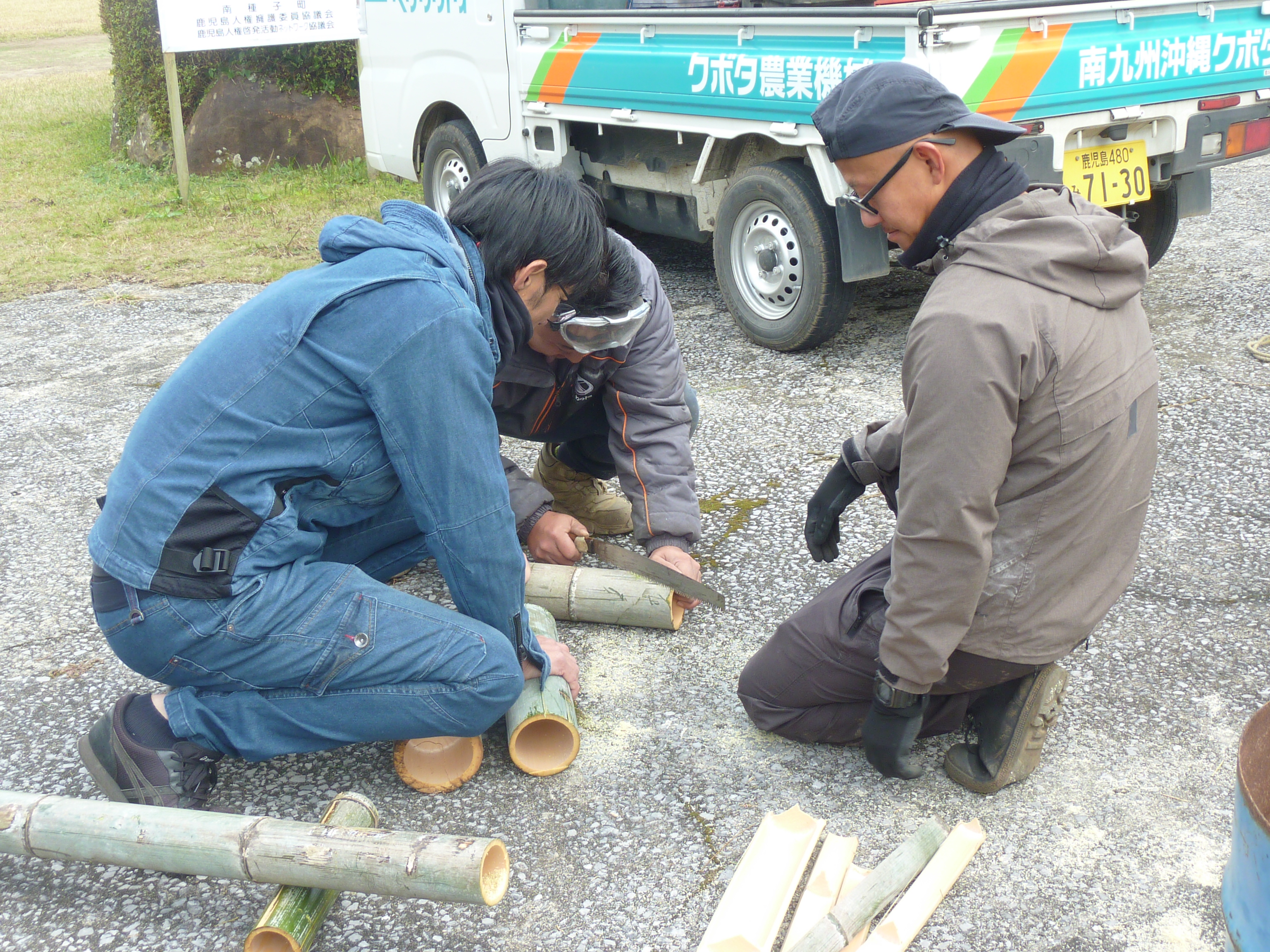 子供たちが用意した竹を並べて,きびります。※きびる・・・鹿児島弁で『(ひも等で)結ぶ』
