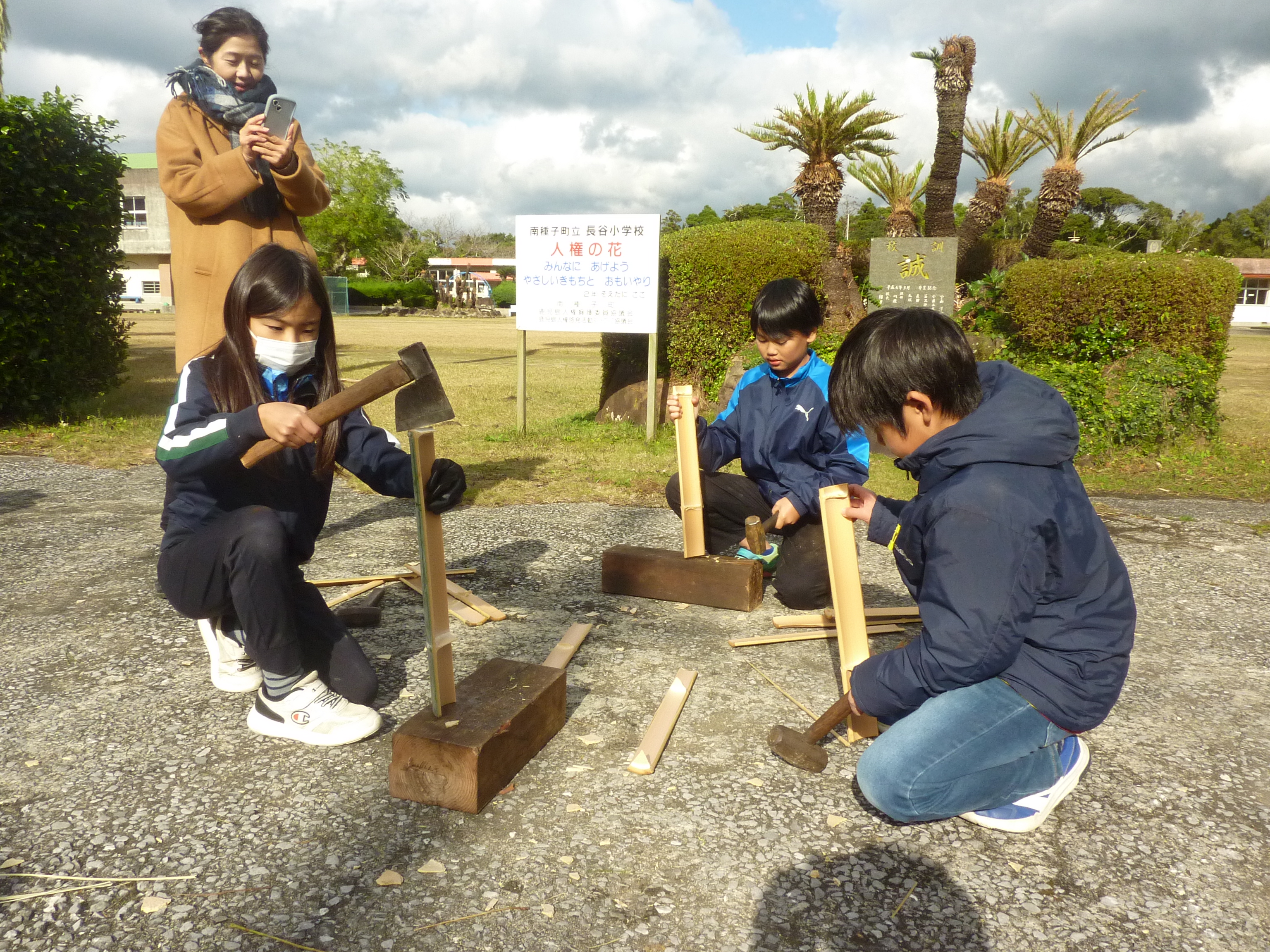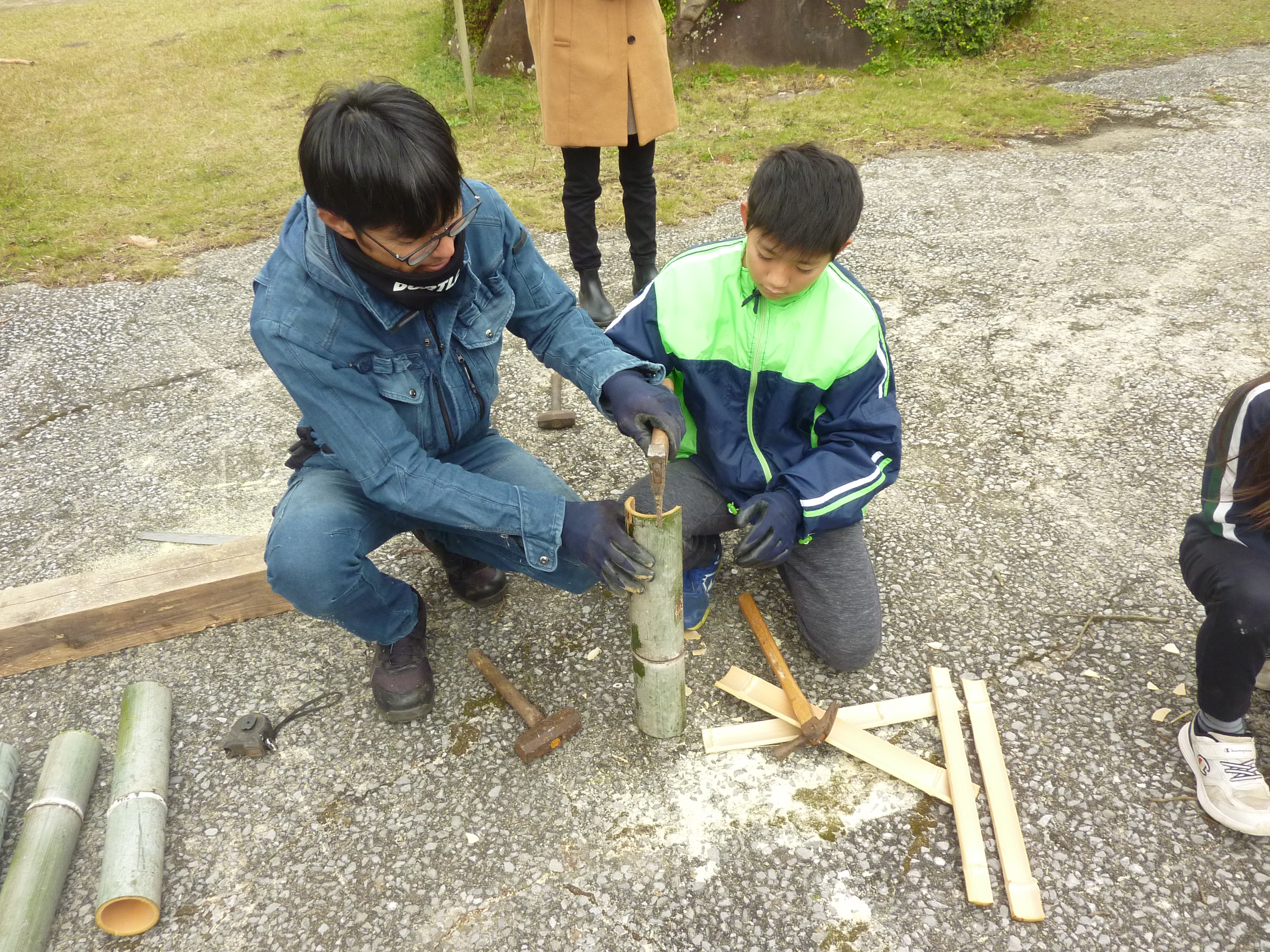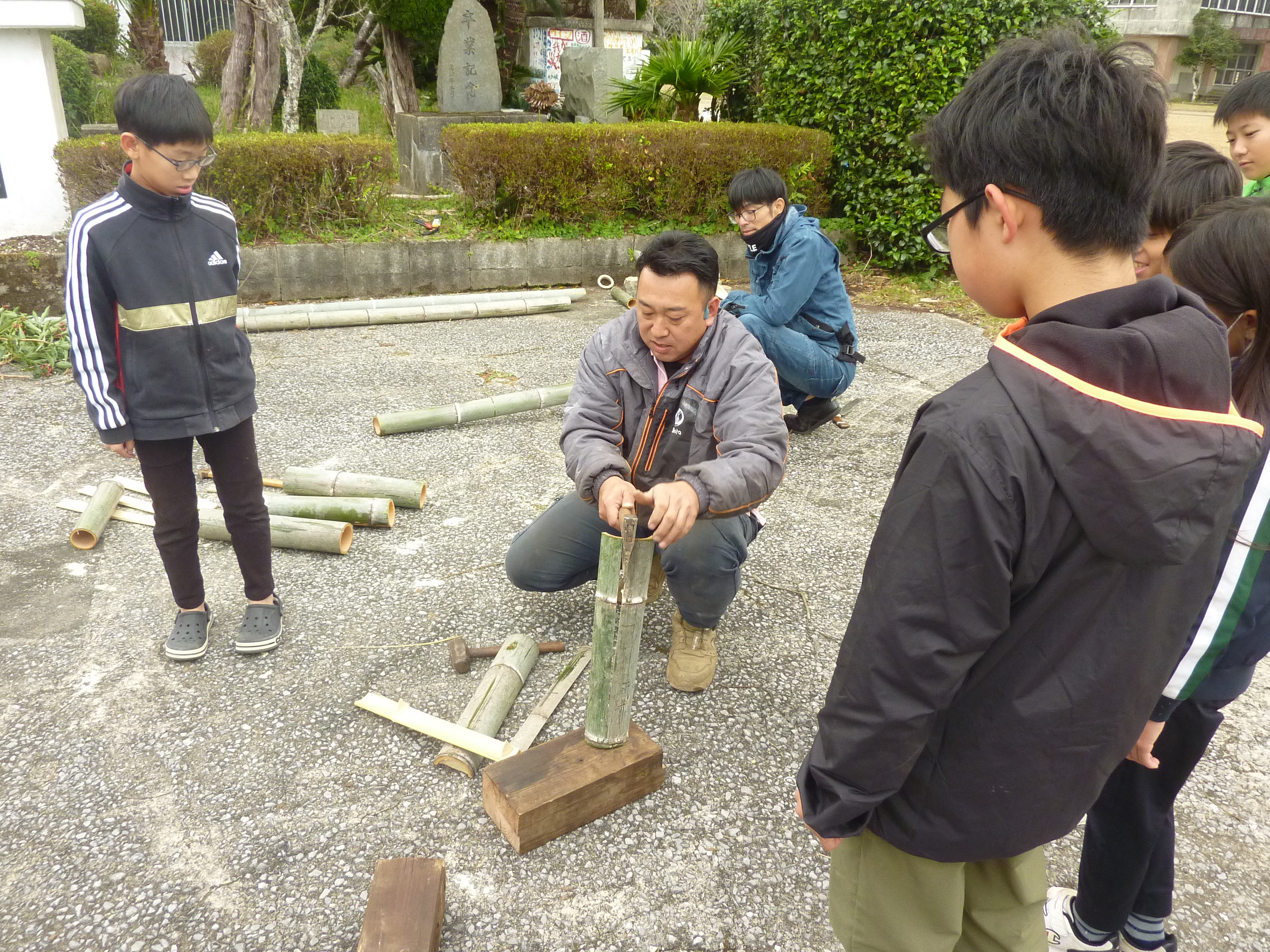 PTA会長による,竹の割り方講座。割った竹をドラム缶の周りに並べるための大事な作業,子供たちもすぐにトライし,段々上手にできるようになりました