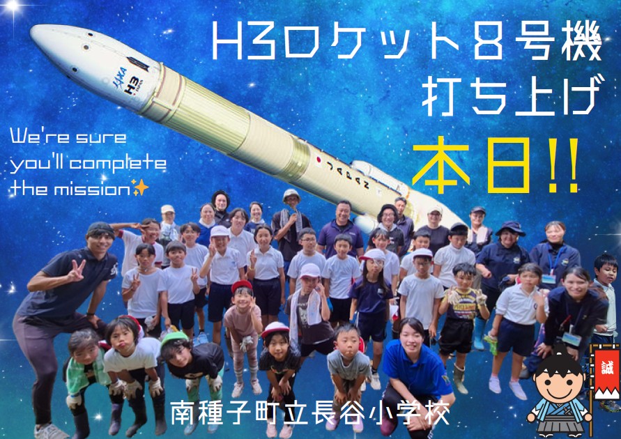 H3ロケット8号機,本日打ち上げ予定です。カウントダウン応援サポートプログラムに長谷小学校も参加し,テイクオフ当日の本日,ポスターが公開されました。南種子町ホームページのトップ画面に掲載されていますので,是非御覧ください🚀 がんばれ,8号機!