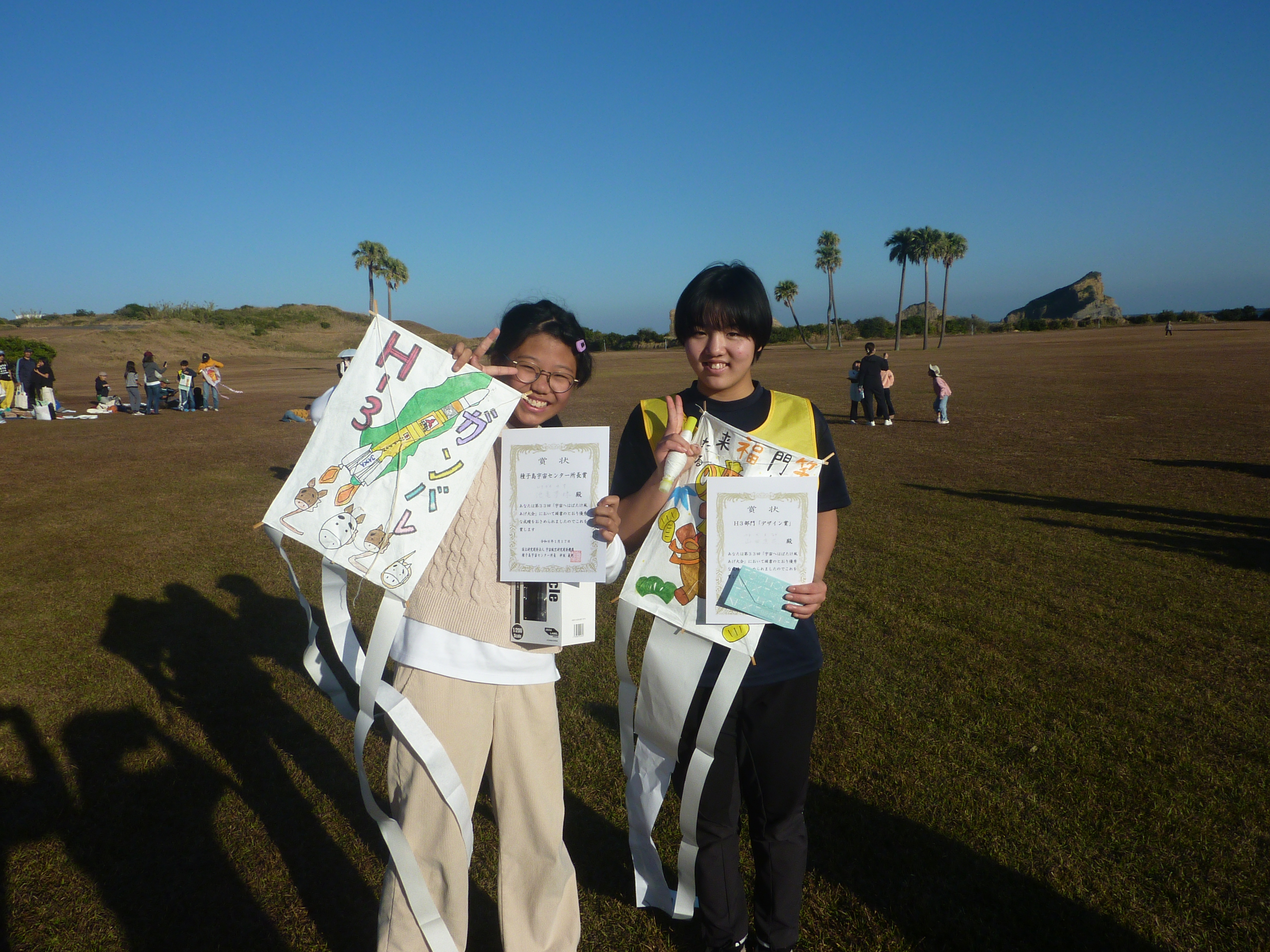 凧あげタイム終了後,いよいよ成績発表。なんと本校から2名,デザイン賞と種子島宇宙センター所長賞に選ばれました!おめでとうございます!